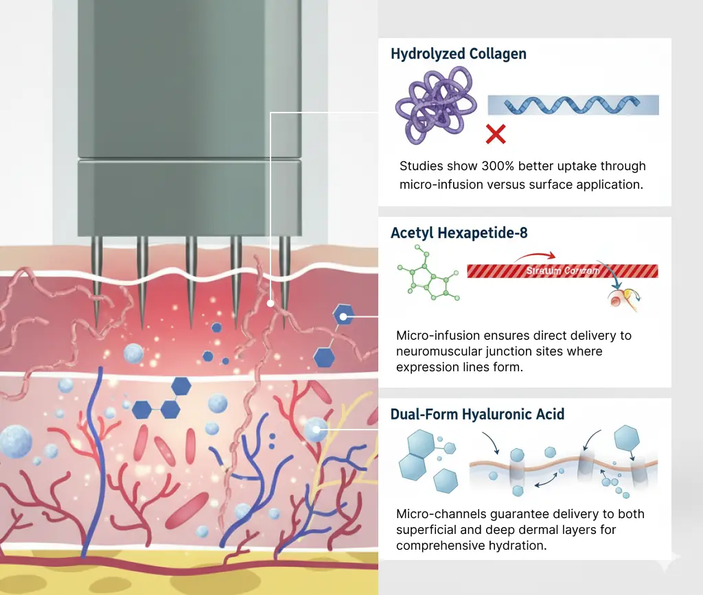 This muscle-relaxing peptide cannot cross the stratum corneum barrier naturally. Micro-infusion ensures direct delivery to neuromuscular junction sites where expression lines form.